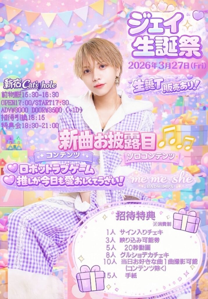 特典•5shot撮影券(携帯)、「愛猫」アコースティックver.ミュージックカード、生誕オリジナルステッカー(全3種ランダム)